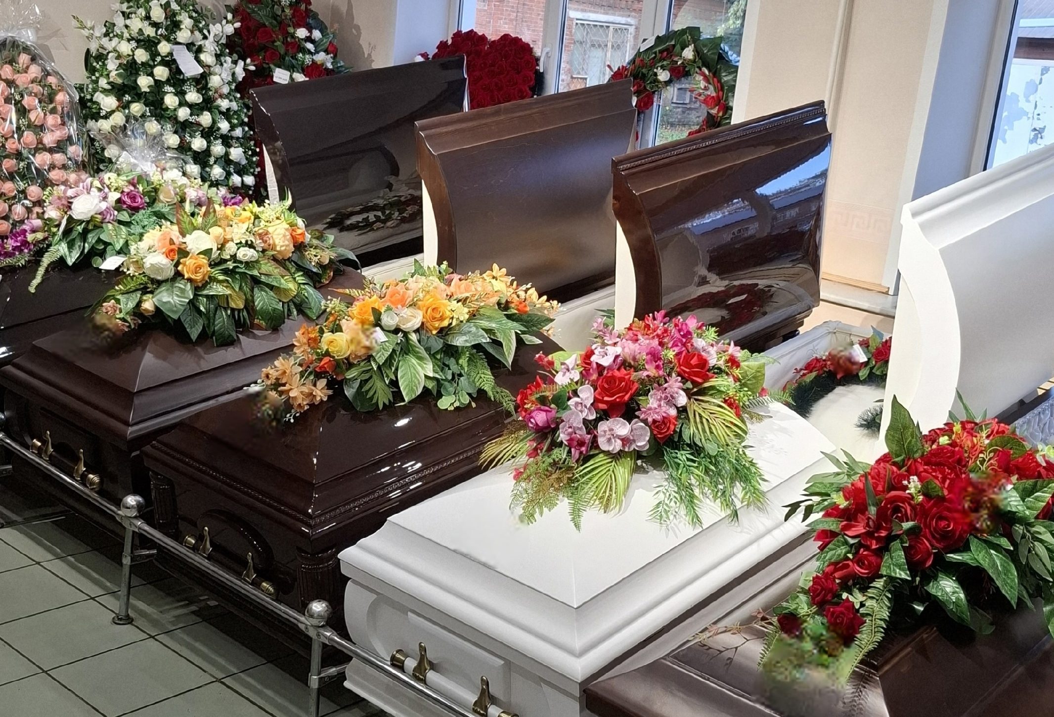 Церемония прощания с близким требует специальных принадлежностей. Чтобы организовать традиционные похороны, нужен гроб или урна для праха, комплект одежды и постели для усопшего, венки, цветы, ленты и другие необходимые товары.